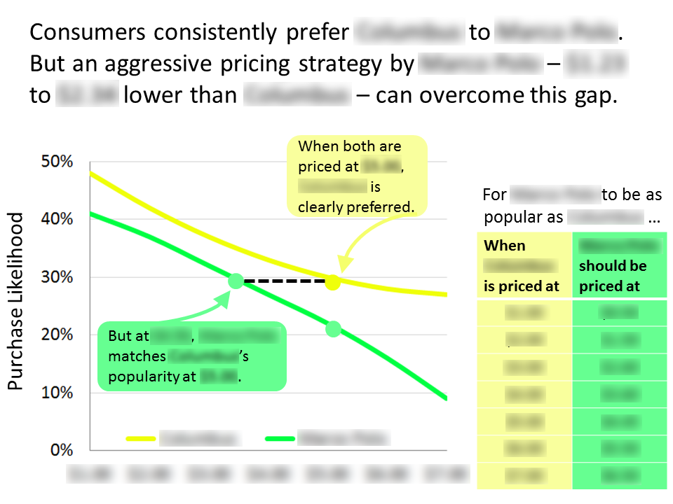 A well-established CPG company with a flagging brand wanted to understand consumer preferences within its category. We crafted a Discrete Choice Model to measure consumer preferences and trade-offs involving brand, price and several other product-relevant attributes. The client learned that their product could prevail if it were priced lower than the competition, and further, that this "price gap" was largest at extreme (high or low) price points.