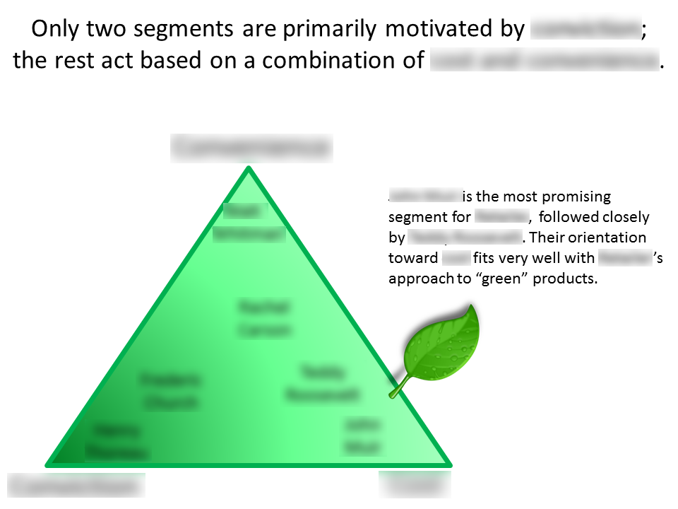 As part of an environmentally-themed initiative, a retailer needed to categorize consumers into "green" segments. We designed a segmentation study based on a battery of questions about attitudes toward the environment, as well as everyday behavior with environmental consequences. The client came to realize that "green" behaviors may be driven by many different factors including attitudes (e.g. conservation), convenience (e.g. recycling), and economics (e.g. carpooling).