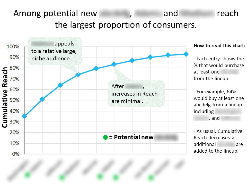 When a Consumer Packaged Goods manufacturer needed to know how some potential new products would impact their existing line, we designed a T.U.R.F. analysis (Total Unduplicated Reach and Frequency) to assess the situation. With the study's results, and a custom-made simulator, the client was able to identify the most promising new products and jettison the least important existing products. And, through benchmarking against existing products, we were able estimate the sales potential of their new offerings.